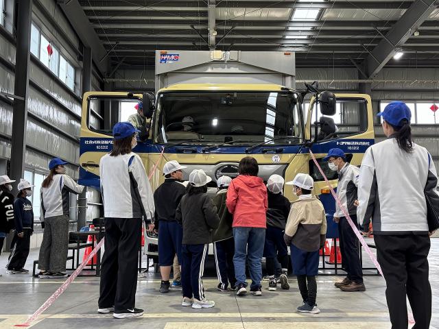 今年も豊田市役所、豊田警察署ご協力のもと、キャリアカーや参加児童に描いていただいた絵をラッピングしたトラックを用いて、死角や内輪差、横断歩道の正しい渡り方について学んでいただきました。